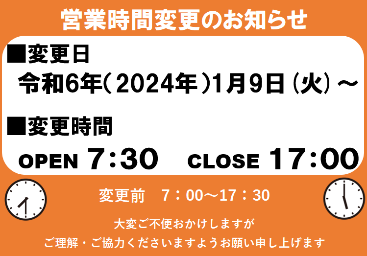営業時間変更 2024/02/22 令和6年1月より営業時間を変更いたしましたので、下記からご確認くださいますようお願いいたします。 ※画像をクリックすると大きな画面でご確認いただけます。 今後とも株式会社トーケンリースをよろしくお願いいたします。